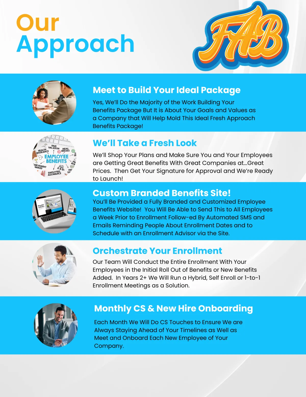 At Fresh Approach Benefits, we leverage multiple carriers, vendors and relationship partners to bring a complete Fresh look at your company's opportunities to improve and thrive more than ever before. We don't just narrow in on what we directly offer, we make sure that if we don't do it, we have a trusted partner that does. If you need something and don't see it on our menu, just ask and we will make sure to bring you trusted resources!